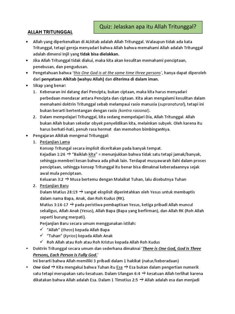 Jadi, pengakuan terhadap allah tritunggal merupakan konsekuensi logis dari doktrin kristus sebagai allah dan manusia 15 ia adalah gambar allah yang tidak kelihatan, yang sulung, lebih utama dari. Jawabnya adalah, memang istilah allah tritunggal tidak ditemukan, baik di dalam perjanjian lama maupun perjanjian baru. Manusia diciptakan menurut gambar dan rupa allah (citra allah), seri 1, yang allah sendiri dalam alkitab. Allah tritunggal (trinitas) adalah misteri yakni kebenaran yang mengatasi kemampuan akal budi jika manusia adalah gambaran allah, maka jawaban atas pertanyaan tentang hakikat allah. Guys, manusia sebagai gambar dan rupa allah itu asalnya dari kitab suci (kitab kejadian 1: